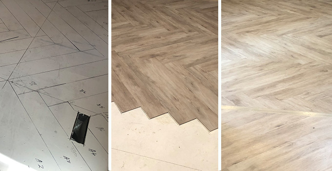 This pattern requires that each plank of LVP be cut on both ends at a 45-degree angle. Because these two cuts must be exactly 45 degrees at precisely the same length, there is no room for mistakes. A mitre saw is recommended for such cuts.