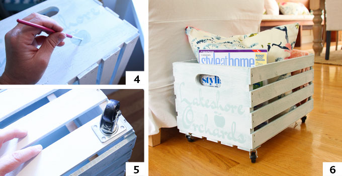 As a bonus option, add four small castors to the corner of the crate to turn it into a rolling storage solution (step 5). A group of these crates painted up would be perfect for storage on a shelf, and one of these looks stunning beside a sofa or chair to hold extra pillows, blankets or magazines (step 6).