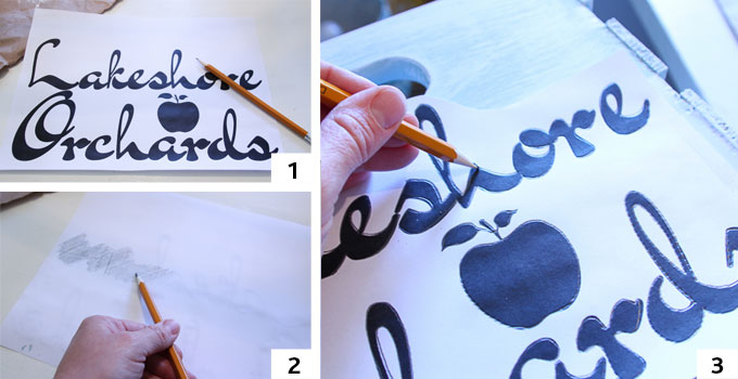 Simply print the graphic off the computer (step 1). Then, in order to transfer the design to the crate, use a pencil to colour in the back of the graphic (step 2). Once the whole back is coloured in, turn it over onto the crate and use the pencil to trace around the edges of the lettering and design (step 3). This method acts like DIY-transfer paper, allowing you to transfer the design onto your project so you can see where to paint it.