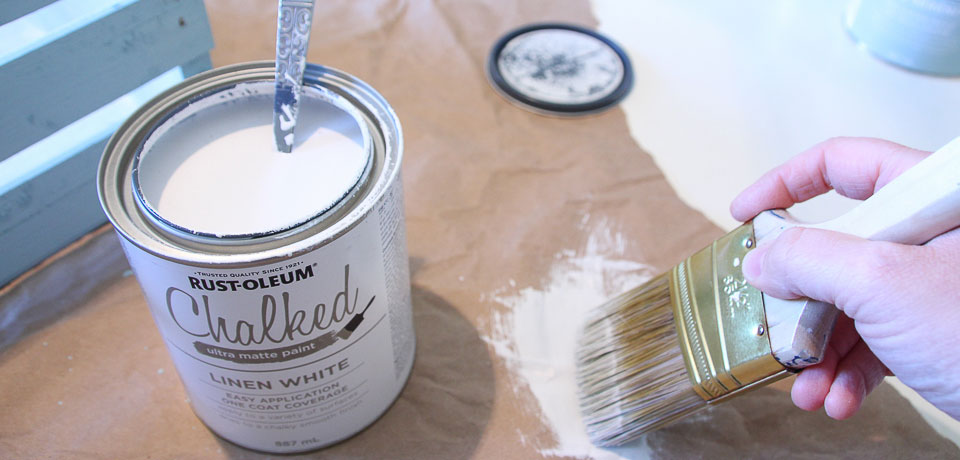 If you have some basic carpentry skills, you can build your own crate with some small pieces of scrap wood; alternatively, pick one up from a yard sale or purchase an unfinished one. Select two colours of chalked paint. I’m using Rust-Oleum’s Serenity Blue and Linen White, but you can choose any combination of colours based on personal preference.
