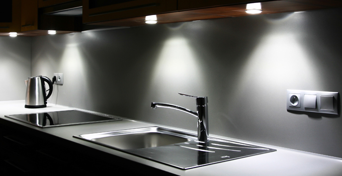 There are three general types of lighting in a kitchen: ambient (to light the entire space), task (to light a surface) and accent (to highlight a cabinet or feature). The ideal lighting scenario in a kitchen is to keep ambient and task lighting at a minimum. Also, consider the option of LED lights as they emit minimal heat and use less energy. Place different types of lights on different circuits so that you can turn them off and on independently. Adding dimmers is another great way to change the lighting environment in your kitchen.