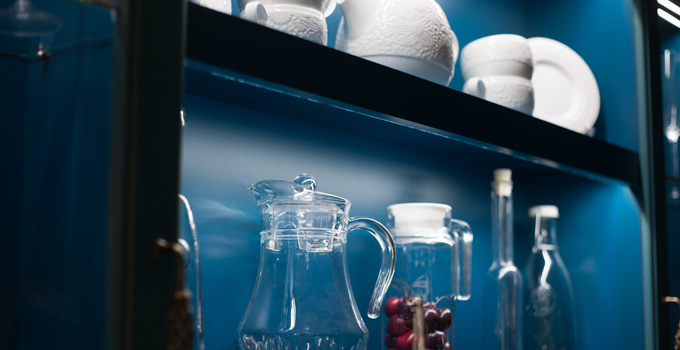 Pot lights inside glass cabinet doors are a stunning way to highlight treasured dishware, art or valuables. This accent lighting has no practical value, but it does add to overall aesthetics. The main consideration is to ensure the chosen light source emits low heat as it is in an enclosed space.