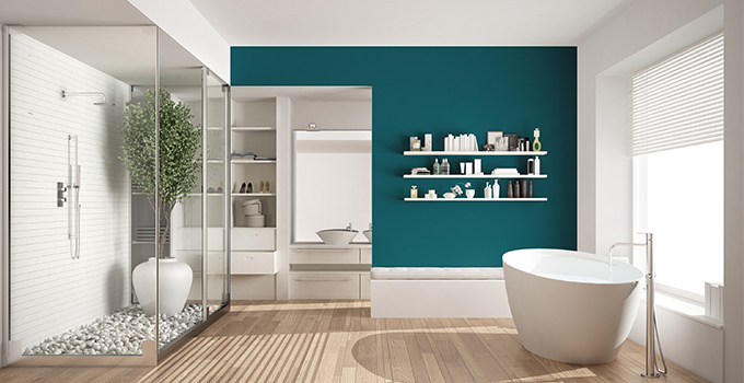 Pro Design Tip: Accentuate the vibrant calm with clean white tile and porcelain for a modern, minimalist feel. The cool tones in the colour pair well with natural woods and plants, bringing the peacefulness of the forest right into your bathroom.