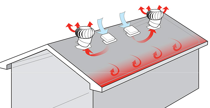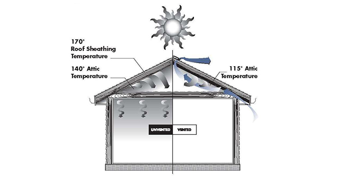 - Proper soffit ventilation that allows cool air to enter through the soffit replacing the warm air that rises through the roof vents