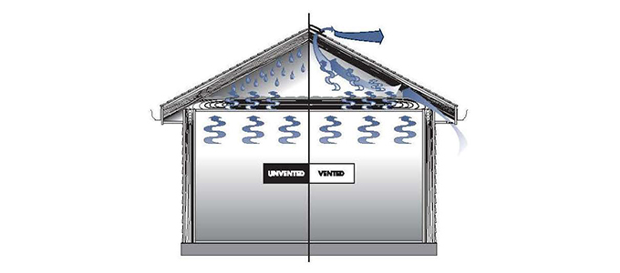 Unvented: Radiant heat penetrating through roof sheathing and attic enters living areas of home. Vented: With proper ventilation the heat is vented out of the attic keeping living areas cooler.