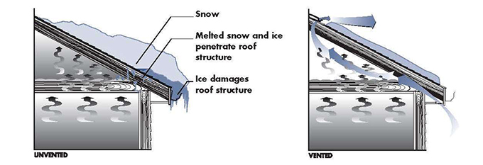 Unvented: Heat entering attic from the home melts the snow on the roof and forms destructive ice dams. Vented: Heat is vented out of the attic creating a cold roof.