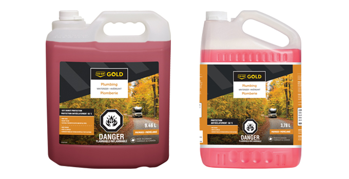 CO-OP® Gold Plumbing Winterizer has been specifically formulated to protect and prevent freeze damage down to -50 C in drains and fresh-water lines in septic systems, boats, recreational vehicles, seasonal homes and swimming pool filtration systems. Made in Canada, it is completely non-toxic, and when used as directed, it is not harmful to the environment.